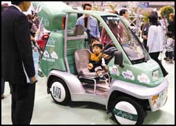 صبي يجلس في سيارة كهربائية صغيرة اسمها ايفي كومز «EV COMS» تعرض في معرض طوكيو للسيارات، وهي مرشحة لتكون سيارة توصيل طلبات.