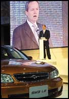 مدير شركة رينو سامسونج يتحدث في مؤتمر صحفي في معرض سول للسيارات وتبدو أمامه أحدث سيارة من إنتاج فرنسي كوري مشترك، والتي أطلق عليها سم 3 لي(SM3 LE) .