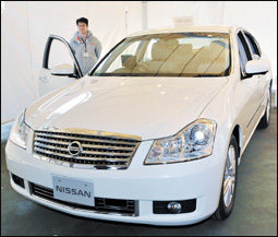 مهندس من شركة نيسان يقف بجوار أحدث سياراتها التي زودت بنظام يمنع السائقين من النوم أثناء القيادة من خلال التعرف على تعبيرات الوجه. أ.ف.ب