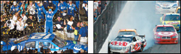 يان نيومان يحتفل بفوزه بالمركز الأول في سباق ناسكار بفلوريدا الأمريكية.وفي الصورة الثانية ديفيد راجان يرتطم بجدار الحلبة بسيارته رقم6 من نوع فورد أثناء مشاركته في نفس السباق. رويترز