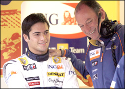 سائق رينو للفورميولا1، البرازيلي نيلسون بيكويت، يتحدث لفني الصيانة لسيارته خلال فترة تدريب بحلبة كتالونيا للسباقات. رويترز