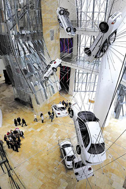 زوار معرض جوجنهاين في إسبانيا يسيرون تحت سبع سيارات معلقة في بهو معرض للعجائب والغرائب في العالم تحت مسمى: أريد أن أصدق