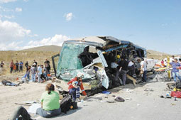 الشرطة وعمال الإنقاذ يخرجون جثث ضحايا حادث حافلة ويساعدون بقية الركاب على الخروج من الحافلةبعد تعرضها لحادث اصطدام مع شاحنة كبيرة في شمال المكسيك، حيث قتل أحد عشر شخصاً بينهم ثمانية أمريكيين