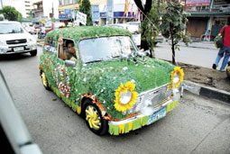 شاب فلبيني يقود سيارة كوبر مغطاة بكسوة خضراء و أنوارها الأمامية مثل زهرة الشمس، بينما غطيت إطاراتها بالموز، ويحاول الفلبيني أن يجوب شوارع مانيلا لتذكير المتفرجين بأهمية حماية البيئة والتوجه نحو الخضرة.
