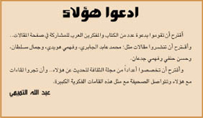 آخر صفحة من ملحق (المجلة الثقافية) ص23 العدد 265 الصادر بتاريخ الاثنين 8 من محرم 1430هـ وفي الأسفل منها تلك المداخلة الماتعة والجيدة والمشاركة الكبيرة في مضمونها ومعناها. وذلك تحت عنوان (ادعو هؤلاء للأخ عبدالله التميمي حيث اقترح عليكم أن تقوموا بدعوة عدد من الكتاب والمفكرين العرب للمشاركة في صفحة المقالات.. وأقترح أيضا أن تنشروا مقالات مثل محمد عابد الجابري، وفهمي هويدي، وجمال سلطان، وحسن حنفي وعتبي جدعان، كما أقترح أن تخصصوا أعدادا من مجلة الثقافية للحديث عن هؤلاء وأن تجروا لقاءات مع هؤلاء) أ.هـ.