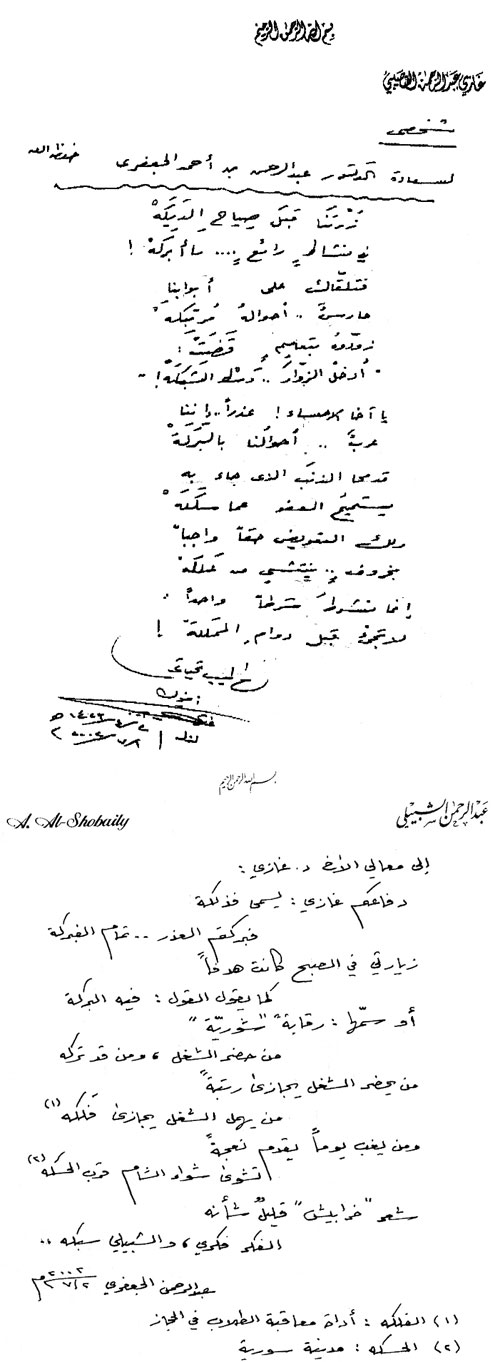 زودنا الدكتور عبد الرحمن الشبيلي بنصين متبادلين بين الدكتور غازي القصيبي- رحمه الله- والدكتور عبد الرحمن الجعفري حين زاره الأخير في مكتبه وبدا دور الشبيلي في الصياغة الجعفرية ، وهذه واحدة من مئات الإخوانيات التي يحتفظ بها محبو القصيبي الذي يقول الشعر - حسب الوصف الخويطري - مثلما يشرب الماء ويتنفس الهواء.