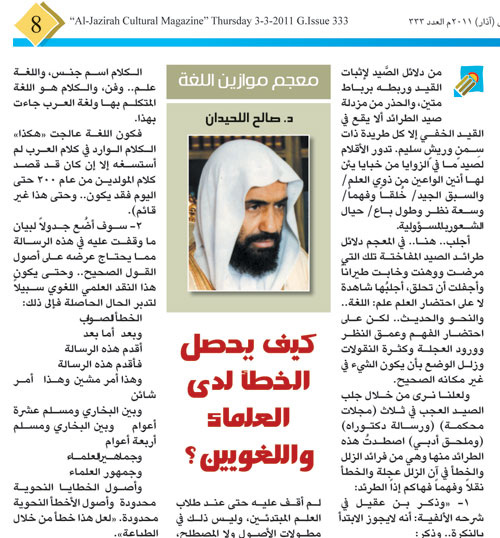فقد قرأتُ للأخ الدكتور صالح بن سعد اللحيدان في زاويته (معجم موازين اللغة) الذي تضمنه عدد المجلة الثقافية (333) الصادر يوم الخميس 28 ربيع الأول 1432هـ، ملاحظاته على كلام بعض الباحثين وحكمه عليها بالخطأ بسبب العجلة. وأستطيع القول: إن