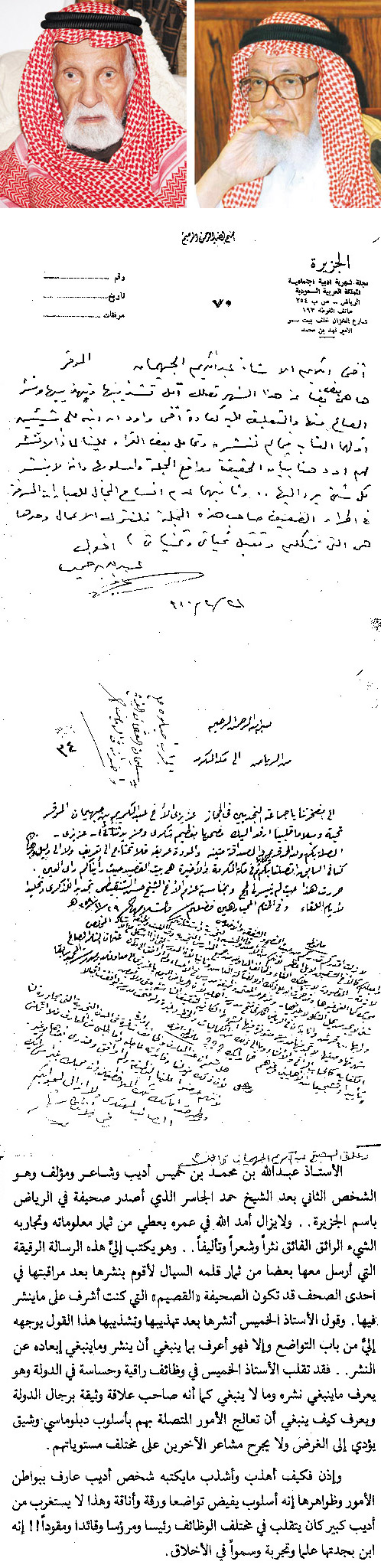 أدرك بين وقت وآخر قيمة هذه الثروة الكبيرة من خلال الرسائل الصادرة منه رحمه الله والواردة إليه.. فهناك المئات من هذه الرسائل، وإن جاز التعبير أرى فيها فناً بدأ ينقرض الآن إلا لدى القليل من الناس، وعندما أبدأ بقراءة الرسالة لا أستطيع فحص رسالة أخرى إلا عندما أكمل
