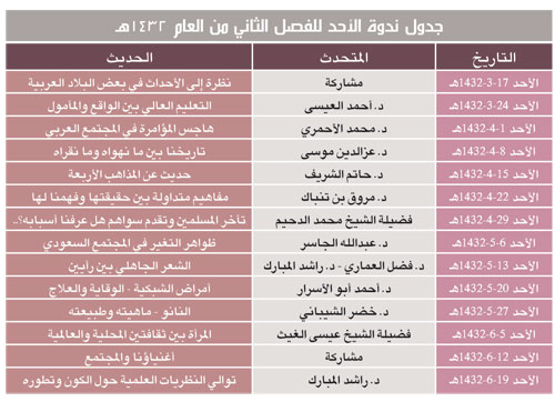 تعد أحدية راشد المبارك من الصالونات الثقافية المهمة في وطننا العربي؛ فقد نوقش فيها طيلة ثمانية وعشرين عاماً من مسيرتها المئات من الأوراق وحضرها ساسة وحكماء ومفكرون وأكاديميون ومبدعون من كافة التخصصات والرؤى والتوجيهات، وابتدأت الأحدية نشاطها الثقافي الحالي من مساء الأحد الماضي 10-3-1432بمحاضرة عن (حدود العقل وفسحة الشريعة) للأستاذ محمد المطوع وسيقام في مساء