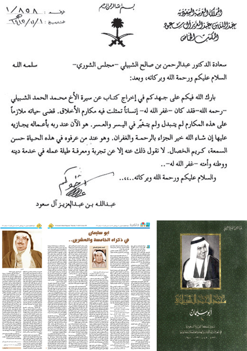 بعث الدكتور عبدالرحمن الشبيلي برسالة تعقيبية إلى الثقافية ضمنها خطاباً خاصاً تلقاه من خادم الحرمين الشريفين حفظه الله بعد اطلاعه على كتابه التوثيقي عن السفير محمد الحمد الشبيلي