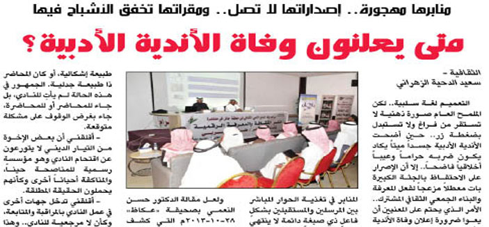 لقد ساءني أن يتصدى الصديق الجميل الأستاذ سعيد الدحية الزهراني لملفّ الأندية الأدبية بهذه السطحية المدهشة (انظر: المجلة الثقافية ذات العدد415).. ساءني أن يخلط الأوراق من حيث جاء ليجمعها، وأسفتُ عليه كثيرا وأنا أراه يقرِّر وحده موتَ الأندية الأدبية، ويطالب بالإعلان عن وفاتها؛ مستهيناً - من حيث لا يدري - بأربعة عقود من الجهد الكبير... بستة عشر نادياً... بمئات المثقفين والمثقفات الذين يعملون (الآن) من خلالها... بأكثر من ألف إصدار... بما لا حدّ له من المحاضرات، والندوات، والجمعيات، والحلقات، واللجان، والملتقيات، والجوائز، والشراكات..