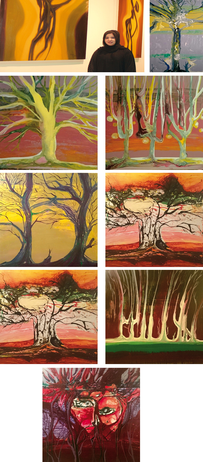 وتكمل حكايتها بين الكلمة واللون والخطوط «لكل هذه الأشجار سيرة الجبال التي يقتلها الجفاف.. ووثيقة الوفاء في زمن الخيانة.. وتميمة الصدق في رقبة الكذّابين... تلوّح بأصابع أغصانها للفراشات التي لم تعرف بعد مكيدة النار فتصدقها النداء.. وتظلّل قبرًا قديمًا لا يُعرف صاحبه.. وتترك في أغصانها متسعًا لأعشاش العصافير المسالمة».