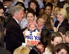 الرئيس الامريكي بيل كلينتون يرحب بالسيدة لورافليشر زوجة الطيار الامريكي الاسير فليشر وابنتها كيت البالغة من العمر خمسة شهور بعد الانتهاء من خطابه امام مجموعة هامتون رودز العسكرية في مركز تورفولك البحري، واعلن كلينتون انه سيبذل قصارى جهده لعودة الاسرى الى ديارهم سالمين.