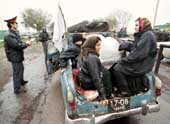 جندي ميليشيات روسي يفحص وثائق وأوراق هوية بعض اللاجئات الشيشانيات المتجهات صوب انقوشيا عند نقطة تفتيش كافكاز على الحدود الانقوشية الشيشانية وطبقا للأرقام الرسمية الروسية فان عدد اللاجئين الشيشان وصل الى 212 الف لاجىء.
