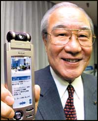 يواتشي موريشيتا مدير شرطة ماتسوشيتا الالكترونية اليابانية يعرض نموذجاً للهاتف المرئي في حفل نهاية العام في طوكيو حيث من المتوقع شن حملتها من اجهزة المساعدة الرقمية الشخصية للجيل القادم في عام 2001م.