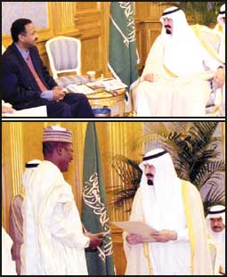 تسلم صاحب السمو الملكي الأمير عبدالله بن عبدالعزيز نائب خادم الحرمين الشريفين رسالة لأخيه خادم الحرمين الشريفين الملك فهد بن عبدالعزيز آل سعود ـ أيده الله ـ من الرئيس أولو شيغون اوبسانجو رئيس جمهورية نيجيريا الاتحادية. وقام بتسليم الرسالة لسموه وزير الخارجية النيجيري الحاج سولي لاميدو خلال استقبال سموه له في مكتبه بالديوان الملكي في قصر السلام أمس. ونقل معاليه خلال اللقاء تحيات وتقدير فخامة الرئيس أولو شيغون أوبسانجو لخادم الحرمين الشريفين الملك فهد بن عبدالعزيز آل سعود ولصاحب السمو الملكي الأمير عبدالله بن عبدالعزيز كما حمله سموه تحياته وتقديره لفخامة الرئيس النيجيري.كما تسلم نائب خادم الحرمين رسالة من أخيه فخامة الرئيس عمر حسن البشير رئيس جمهورية السودان الشقيقة.