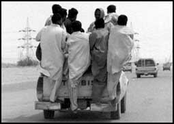 مجموعة من العمال قد اهملوا أبسط احتياطات السلامة في تعلقهم بسيارة كانت تنقلهم الى مقر سكنهم بأحد أحياء شرق الرياض. .........