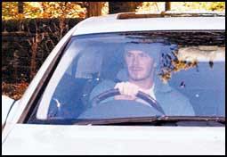 نجم الكرة الانجليزي ديفيد بيكهام يحاول تحاشي الصحافيين بسيارته بعد القبض على المتهمين بمحاولة اختطاف زوجته.