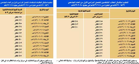 * الرياض - عبد الله العماري: أوضح عميد القبول والتسجيل بجامعة الإمام محمد بن سعود الإسلامية الدكتور عبد العزيز بن راشد العبيدي أن الجامعة ستقبل أكثر من عشرة آلاف طالب وطالبة في العام الدراسي 26 - 1427 هـ في الانتظام وأيضا بنظام الدورة المكثفة في جميع التخصصات. وأضاف الدكتور العبيدي انه تم زيادة أعداد المقبولين في التخصصات التي تشهد إقبالا شديداً التي تجد فرصا كبيرة في سوق العمل مثل الحاسب الآلي واللغات والترجمة واللغة العربية. كما تم تخفيض الأعداد المقبولة في التخصصات التي تقل فرص عمل الطلاب فيها مثل العلوم الاجتماعية بأقسامها علم النفس والخدمة الاجتماعية وعلم الاجتماع والجغرافيا والتاريخ، إضافة إلى قسم الدعوة حيث يتاح للطلاب التسجيل في هذه الأقسام وفقا لرغبتهم الأولى. وشدد عميد القبول والتسجيل في حديثه لل(الجزيرة ) على ضرورة التزام الطلاب بالأيام المحددة لهم مبينا في الوقت نفسه أن الطالب يمر بأربع خطوات عند تسجيله في الجامعة هي: المرحلة الأولى وهي حصول الطالب على كشف بنسبته المكافئة وموعد تسجيله، بعد ذلك يتم تسليم الطالب نماذج التسجيل وبعد ان يقوم بتعبئة النماذج يمر بالمرحلة الثانية وهي التدقيق، بعدها يتجه الطالب إلى المسجلين - وهي المرحلة الثانية - الذين يقومون بإدخال بيانات كل متقدم وتزويد كل منهم برقمه الجامعي، حيث يتجه الطالب بعدها للمرحة الرابعة وهي التصوير تمهيدا لإصدار بطاقته الجامعية التي يتم تسليمها مع بداية الفصل الدراسي، مشيراً الى أن هذه الخطوات تستغرق من 10 إلى 15 دقيقة. وأشار الدكتور العبيدي إلى ان إقبال الطلاب بالدرجة الأولى على كلية الشريعة يليها كلية الحاسب الآلي ثم اللغات و الترجمة ثم كلية اللغة العربية.. أما الطالبات فيقبلن على الحاسب الآلي يليها اللغات والترجمة. وقال الدكتور عبد العزيز بن راشد العبيدي عميد القبول والتسجيل بالجامعة إنه تم وضع عدة شروط للقبول هي : أن يكون الطالب حاصلاً على الشهادة الثانوية من المعاهد العلمية التابعة للجامعة أو الثانوية العامة أو ما يعادلها من داخل المملكة أو خارجها. وألا يكون قد مضى على حصوله على الشهادة الثانوية مدة تزيد على خمس سنوات. وأن يحصل المتقدمون من الطلاب في النسبة المركبة على 70% فأعلى، والنسبة المركبة تمثل : (30% من اختبار القدرات70 % من معدل الثانوية العامة). ويمكن للطالب مراجعة موقع العمادة على الإنترنت لاحتساب النسبة المركبة. وبالنسبة للطالبات الحصول على نسبة 85% فأعلى من معدل الشهادة الثانوية. ويقتصر القبول في كلية علوم الحاسب والمعلومات على خريجي الثانوية العامة قسم العلوم الطبيعية، ويشترط ألا تقل نسبة المتقدم عن 88% في اختبار الثانوية، وفي النسبة المركبة عن 83%، (للطلاب فقط)، أما بالنسبة للطالبات فيشترط ألا يقل معدل الثانوية العامة عن 90%، وأن تكون حسنة السيرة والسلوك. وأن يجتاز المتقدم لقسم اللغة الإنجليزية وآدابها بكلية اللغات والترجمة بالرياض اختبار تحديد المستوى الذي يجريه القسم المختص، وأن يكون لائقاً طبياً، وأن يحصل على موافقة من مرجعه بالدراسة إذا كان يعمل في أي جهة حكومية أو خاصة، وموافقة ولي الأمر بالنسبة للطالبات. أما عن المستندات المطلوبة فقال إنه يجب على الطالب إحضار: أصل استمارة النجاح في الشهادة الثانوية، مع ثلاث صور منها، وأصل شهادة حسن السيرة والسلوك مع ثلاث صور منها، وثلاث صور من بطاقة الأحوال للطالب واضحة، وثلاث صور من دفتر العائلة للطالبات، مع إحضار الأصل للمطابقة، وست صور شمسية حديثة، مقاس (4 في 6) سم، مع كتابة اسم الطالب خلف كل منها (للطلاب فقط)، إحضار موافقة العمل على الدراسة إذا كان المتقدم موظفاً، وموافقة ولي الأمر بالنسبة للطالبات. وأضاف الدكتور العبيدي أن الجامعة ستستقبل الطلاب وفقاً للجداول التالية: الأقسام والنسب المطلوبة للالتحاق بكليات الجامعة طلاب الكلية النسبة المركبة الثانوية العامة شروط أخرى العلوم الاجتماعية 70% فأكثر حسب توفر المقاعد اللغة العربية 70%