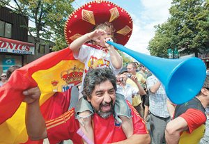 في برشلونة (شمال شرق)، عاصمة كاتالونيا، احتشد نحو 75 ألف شخص لمتابعة المباراة على شاشة علاقة مثبتة للمرة الأولى. وأوضحت الشرطة في بيان لها أن «نحو 20 ألف شخص واصلوا الاحتفالات بعد الفوز و21 شخصًا تم اعتقالهم»، بسبب «الإخلال بالنظام العام»، مضيفًا «أصيب أيضًا 74 شخصًا بجروح نتيجة هذه الحوادث بينهم 12 شرطيًا، وتم نقل 21 مصابًا إلى المستشفى». وفي إقليم الباسك (شمال)، ألقي القبض على ثلاثة أشخاص، فضلاً عن شخصين في بلباو وآخر في زاروتز. ولم تسجل أي أحداث في العاصمة مدريد التي احتشد فيها قرابة 250 ألف شخص لمتابعة المباراة والذين احتفلوا أيضًا طويلاً بعد الفوز باللقب.