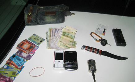 وبتفتيشه وجد بحوزته حقيبة صغيرة مربوطة على وسطه وبداخلها جهازين جوال من نوع نوكيا ومبلغ (286) ريالاً وكروت تعبئة بنزين تابعة لإحدى محطات الوقود بلغ مجموعها (380) لتراً كما وجد معه سلاح أبيض (سكين) بها آثار دماء، وقد ذكر المتهم أنه اشترك مع مرافقه بالاعتداء على وافد آسيوي بسكين وسلبا نقوده بحي الجزيرة شرق الرياض، وقد اتضح أن المجني عليه مصاب بطعنة من أثر اعتداء بسلاح أبيض وسلب نقوده وتم نقله لمستشفى الإيمان عن طريق الهلال الأحمر، تم التحفظ على المتهم وسلم الجاني لمركز شرطة المنار.