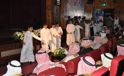 ثم حيا مجموعة من الطلبة المتفوقين على مدى ثلاثة أعوام متوالية وشكروا له تشريفه مقدمين له هدية خاصة عبارة عن لوحة تحمل شعار المملكة على شكل اسم الملك عبدالله قام بتصميمها الأستاذ صالح السلامة رئيس شعبة الحاسب الآلي. بعدها توجه سموه للمقر المعد للاحتفال «مسرح إدارة التربية»، والذي بدئ بالسلام الملكي ثم القرآن الكريم، بعد ذلك ألقى مدير إدارة التربية والتعليم كلمته بهذه المناسبة والتي شكر فيها سمو أمير منطقة القصيم وسمو نائبه على هذه الرعاية الكريمة لأبنائهما الطلاب، معتبراً ذلك هو التكريم الحقيقي للطلاب وهو أمر غير مستغرب على سموهما كونهما الداعمين الأساسيين بالمنطقة لأبنائنا الطلاب والميدان التربوي التعليمي بشكل عام. موضحاً أن احتفائية التكريم ستشهد تجسيد الحب والوفاء لأمير العطاء بمناسبة مرور عشرين عاماً على توليه قيادة هذه المنطقة وما كان فيها من رخاء وتطور ونماء، وقد قدم سعادته التهنئة باسم منسوبي التعليم بالمنطقة كافة لكل الطلاب المتفوقين وأسرهم، متمنياً لهم مستقبلاً مشرقاً في خدمة الدين ثم المليك والوطن. بعدها قدم الطالب علي العواجي من ثانوية الملك سعود كلمة الطلاب المتفوقين، حيث قال: يسرني أصالة عن نفسي ونيابة عن إخواني الطلاب المتفوقين أن أقدم لكم باقتين جميلتين بجمال حضوركم وتشريفكم الأولى، ترحيب حار لا تفيه الكلمات حقه، وأجد نفسي عاجزاً عن تسخير الكلمات ليصل المعنى إليكم، لكن عزائي أنه حديث الروح بين الابن ووالده ودائماً حيث الروح للأرواح يسري ويصل دون عناء وتكلف. والثانية: شكر وعرفان على هذا الحضور وهذا التشريف من أعلى سلطة بمنطقتي جاء بتواضع الكبار وأمانة المسؤول وحنان الأب وحرص المعلم تمثل كل هذا بشخصكم الكريم. ثم قال: إنكم وبهذا التشريف تعطون رسالة كبيرة ومهمة للمتفوق ولوالديه ولمعلمه ولإدارته أن التعليم بالمملكة العربية السعودية مهم جداً وترعاه الدولة بكل اهتمام وتُسخِّر له كل الإمكانيات المادية والبشرية. ثم اختتم كلمته بقوله: نعدكم أن نكون عند حسن ظنكم بنا وأن نكمل ما بدأه من قبلنا من أبناء هذا الوطن الصالحين، وأن نبذل قصارى جهدنا لرفعة وطني العظيم المملكة العربية السعودية.