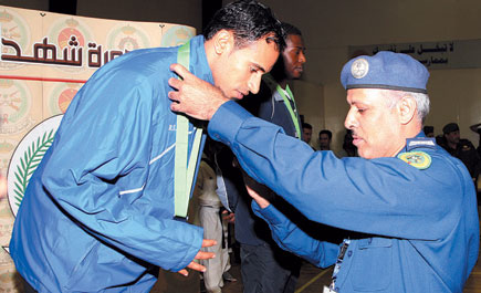 أما البطل سند عيد ناصر الدوسري، من القوات البرية الحائز على الميدالية الذهبية في وزن 74 كيلو فحدثنا جالساً ويده على ركبته من جراء إصابة في الركبة لم يتضح بعد مدى خطورتها تعرض لها في المباراة الأخيرة، لكنه كان متفائلاً بأنها لن تكون بالغة «إن شاء الله».
