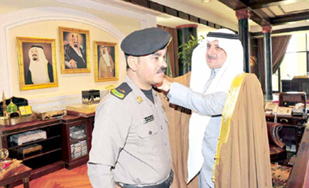من جانب آخر، قلد أمير منطقة تبوك بمكتب سموه في الإمارة أمس أحد منسوبي المرافقين الأمنيين لسموه رئيس الرقباء إبراهيم عليان البلوي رتبته الجديدة. وهنأ سمو أمير المنطقة رئيس الرقباء إبراهيم البلوي بهذه المناسبة متمنياً له التوفيق. وأعرب البلوي عن شكره وتقدير لسمو أمير منطقة تبوك على هذا التكريم.