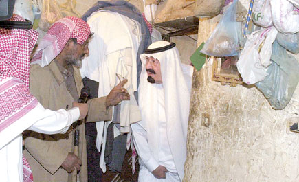 وشوهد الملك عبد الله بن عبد العزيز فارس الشفافية والصدق والواقعية يدخل بيوت المواطنين المعوزين ويتحدث معهم، ويتفقد غرف مساكنهم غرفة غرفة، ويفتح حتى ثلاجات مطابخهم ليكتشف أن بعضهم لم تكتمل لديه حتى الأجهزة الأساسية لكل مطبخ بيت، ويعلن أنه مسئول أمام الله عن حل مشكلات هؤلاء المواطنين وتقديم العون لهم، ويؤكد: (زيارتي هذه لا تحمل الرياء، وأعوذ بالله منه، ولكنها المسؤولية التي تحتم على كل مسئول أن يدرك بأن دوره يتخطى المكاتب).