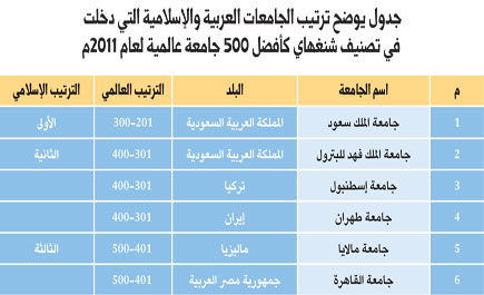 أعلن اليوم تصنيف شنغهاي العالمي للجامعات الذي يحظى بمكانة عالمية بارزة ومتميزة في الأوساط الأكاديمية، حيث يعتمد البحث العلمي ومخراجاته معيار رئيسي له، وقد برزت جامعة الملك سعود في النسخة الأخيرة من التصنيف بدخولها ضمن أفضل 300 جامعة عالمية كإنجاز عالمي غير مسبوق لأي من الجامعات العربية في هذا التصنيف العالمي محتلة المرتبة 261، وبهذا تؤكد جامعة الملك سعود أنها تحظى بالصدارة بين الجامعات العربية والإسلامية دون منافس، ودخلت جامعة الملك فهد للبترول كأفضل 400 جامعة عالمية ضمن التصنيف، ودخلت جامعة القاهرة التصنيف كأفضل 500 جامعة عالمية بعد غياب أربع سنوات عن التصنيف.