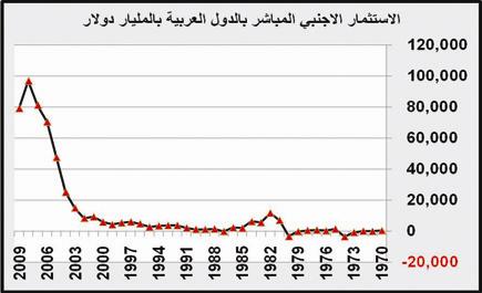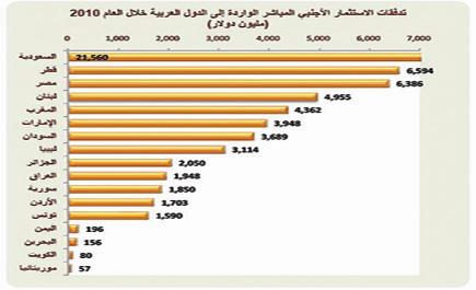 رغم الجهود الحثيثة التي بذلتها الدول العربية لجذب الاستثمار الأجنبي المباشر، ورغم المبالغ التي أنفقتها كثير منها في سبيل ذلك، فإن إجمالي الدول العربية لم يستطع جذب سوى 64.3 مليار دولار في عام 2010م، بنسبة مشاركة لم تزد عن 5.7% من إجمالي الاستثمار الأجنبي المباشر المتدفق عبر العالم، وقد استحوذت السعودية على حوالي 33.6% بقيمة بلغت 21.6 مليار دولار، جاءت بعدها قطر بقيمة 6.6 مليار دولار بنسبة 10.3%، تلاها مصر بقيمة 6.4 مليار دولار بنسبة 9.9%، وتتركز الاستثمارات الأجنبية المباشرة في (8) دول عربية بقيمة تزيد عن 3.0 مليار دولار لكل منها، في حين أن هناك ما يزيد عن (10) دول تقل فيها قيمة الاستثمار الأجنبي المباشر عن 3 مليارات دولار.