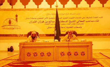 أقام فرع وزارة الشؤون الإسلامية والأوقاف والدعوة والإرشاد في منطقة حائل لقاء لمعالي الشيخ الدكتور صالح بن فوزان الفوزان عضو هيئه كبار العلماء بخطباء وأئمة المساجد والجوامع في المنطقة مساء يوم السبت الماضي 22-1-1433هـ بمنتزه المغواة بحائل. حضر هذا اللقاء عددٌ من أصحاب الفضيلة والمشايخ وطلبة العلم وكافة خطباء وأئمة مساجد وجوامع المنطقة، واستمع خلاله الحضور إلى توجيهات معالي الدكتور صالح الفوزان حول خطبة الجمعة وأهميتها وأثرها، وإلى ما ينبغي على الخطيب والإمام تجاه جماعته. كما قام معاليه بالإجابة على أسئلة الحضور.
