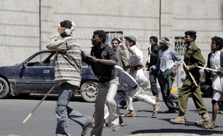 واشتبك المعسكران عندما حاول المعارضون دخول ميدان التحرير وعاد المتظاهرون إلى حرم الجامعة وأغلقت السلطات باب الصرح قبل أن يتفرق المتظاهرون شيئا فشيئا، وفي تعز (جنوب صنعاء) تظاهر الآلاف أيضا للمطالبة بتغيير النظام، وأكدت مصادر من المتظاهرين إصابة ثمانية أشخاص بجروح خلال تفريق التظاهرة.