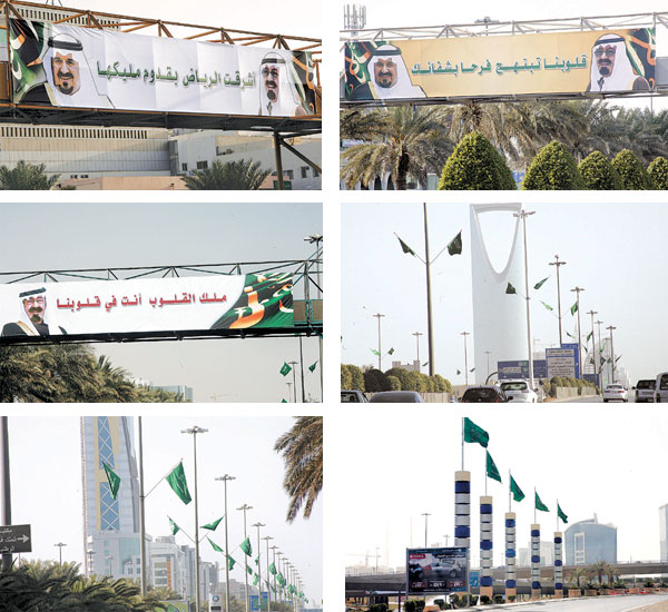 فصول من الغبطة واللهفة غصّت بها أرض المملكة... الميادين والسيارات والطرقات والشوارع وحتى على هام وسفوح البنايات ارتفعت رايات التوحيد الأخضر مد البصر وتوسطت صورة قائد المسيرة كرنفالات الفرح بصورة تعكس حجم الحب الكبير الذي يبادله كافة الشعب لمليكهم وباني نهضة المملكة الحديثة.