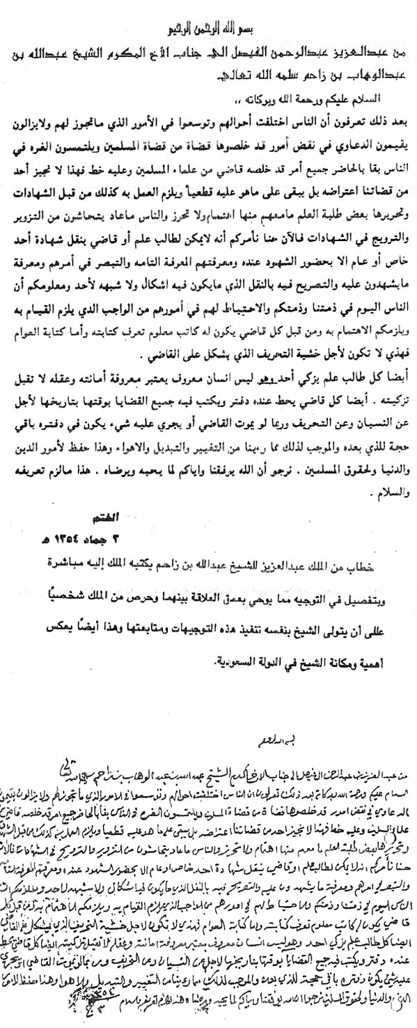 يوما تلو الآخر يتجلى حرص مؤسس هذا الكيان الملك عبدالعزيز بن عبدالرحمن آل سعود، تغمده الله برحمته، على أحوال أبناء شعبه وما ينفعهم وكل ما ييسر أمور حياتهم، ومن هذه الاهتمامات التي كانت تشغل باله.. جانب القضاء. وفي هذا الصدد تنشر (الجزيرة) وثيقة يعود تاريخها لشهر جمادى الأولى من عام 1354هـ وهي من الوثائق الموجهة من الملك عبدالعزيز إلى الشيخ عبدالله بن عبدالوهاب بن زاحم الذي كان قاضيا في ذلك الوقت، وفيها يحثه ويوجهه على أن تتم كتابة قضايا الناس وحقوقهم في سجل بحضور الشهود حتى يتم حفظ حقوق الناس، وتبقى في هذا السجل حتى بعد وفاة القاضي. وقد جاء هذا التوجيه من المؤسس الملك عبدالعزيز خشية اكتشاف تلاعب وتزوير في حقوق الناس وعدم توثيقها. كما تضمنت الوثيقة توجيهات أخرى تتعلق بالقضاء وتزكية الشهود من المؤكد أنها ستكون مرجعا مهما للمختصين والباحثين.
