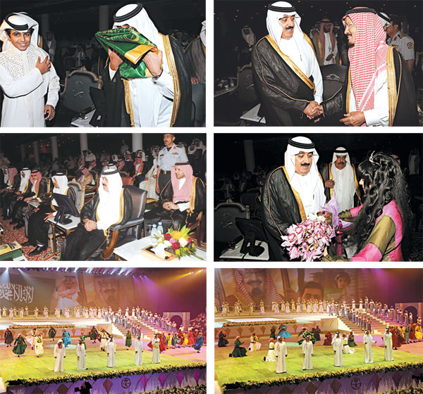 نيابة عن خادم الحرمين الشريفين الملك عبدالله بن عبدالعزيز آل سعود- حفظه الله- رعى صاحب السمو الملكي الأمير متعب بن عبدالله بن عبدالعزيز وزير الدولة عضو مجلس الوزراء رئيس الحرس الوطني رئيس اللجنة العليا للمهرجان الوطني للتراث والثقافة مساء أمس الحفل الخطابي والفني الكبير الذي أقيم في القاعة المغلقة بالجنادرية.