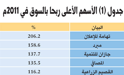 تصدر قطاع الإعلام والنشر القطاعات الرابحة خلال 2011م بنسبة 62.37 %، وذلك في ضوء ربحية أسهمه الثلاثة بنسب مرتفعة، على رأسها سهم تهامة للإعلان.. يليه قطاع التجزئة الذي ربح نسبة بلغ 31.4 %، وذلك في ضوء ربحية سبعة أسهم (من إجمالي تسعة أسهم) على رأسها سهم جرير بنسب هامة أيضاً.. أما القطاع الثالث الأعلى ربحية، فهو الفنادق والسياحة بنسبة 26.1 %، ثم جاء قطاع الأسمنت بنسبة ربحية 26.5 %، ثم جاء قطاع الاستثمار المتعدد بنسبة 24.3 % .. وإذا كانت هذه هي نسب ربحية القطاعات، فإن نسب خسائر القطاعات الخاسرة جاء أعلاها قطاع الاتصالات بنسبة خسارة 14.7 %، ثم قطاع المصارف بنسبة خسارة 12.8 %.