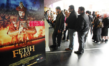 مشاهدو السينما الأتراك في أنقرة قرب ملصق إعلاني لفيلم (فتح 1453) الذي يتناول استيلاء العثمانيين على اسطنبول، حيث شاهد الفيلم من منتصف فبراير الماضي نحو مليوني ونصف المليون مشاهد في أسبوعين فقط، حسب تقارير رسمية. - (الفرنسية)