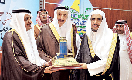 ومضى الوزير قائلاً: لقد تأسست دولتنا الحديثة على كلمة التوحيد وخَطْوٍ مسدد لمنهج السلف الصالح بوسطيته واعتداله، هدى الله إليه مؤسسها جلالة الملك عبد العزيز وأبناءه البررة ملوك هذه الدولة، إلى أن انتهت المسؤولية لخادم الحرمين الشريفين الملك عبد الله بن عبد العزيز الذي أكد بالقول والفعل على أن هذا الأساس المتين ثوابت راسخة وعلامة فارقة في جبين الدولة، وبخاصة في ظل متغيرات عدة يمر بها عالم اليوم، وتجلى هذا الترسيخ في اضطلاعه - يحفظه الله - بمواجهة أيِّ أسلوب من أساليب النيل من قيمنا أو التأثير في مكونات هويتنا، فترجم بقراراته الشجاعة التي لا تعرف التراخي أو المساومة والمزايدة على هذا المكون العظيم الذي رفع الله به منار هذه البلاد، ترجم قوة القيادة وأمانة الريادة، وقد شكَّل هذا البنيان التأسيسي صرحاً شامخاً حمى الله به هذه البلاد من عاديات الشر، والمستقرئ لتاريخها يجد أن دولتنا تجاوزت منعطفات إقليمية ودولية، وتحديداً المتغيرات السياسية والاقتصادية التي عمت العالم، وبخاصة الأزمة الاقتصادية، ويلاحظ كل متابع أن تجاوزها كان في مشهد لافت ومُحَيِّرٍ للآخرين.