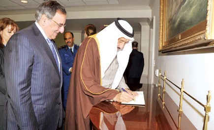 اجتمع صاحب السمو الملكي الأمير سلمان بن عبدالعزيز وزير الدفاع في واشنطن أمس مع معالي وزير الدفاع الأمريكي ليون بانيتا. وفي بداية الاجتماع رحب معاليه بسمو الأمير سلمان بن عبدالعزيز في زيارته الرسمية الحالية للولايات المتحدة الأمريكية، متمنياً لسموه طيب الإقامة. وعبر سمو الأمير سلمان بن عبدالعزيز عن تقديره لما لمسه والوفد المرافق من حفاوة وترحيب، متمنياً للعلاقات بين البلدين مزيداً من التقدم والتطور خاصة وهي تحظى بدعم ورعاية خادم الحرمين الشريفين الملك عبدالله بن عبدالعزيز آل سعود وفخامة الرئيس الأمريكي باراك أوباما.