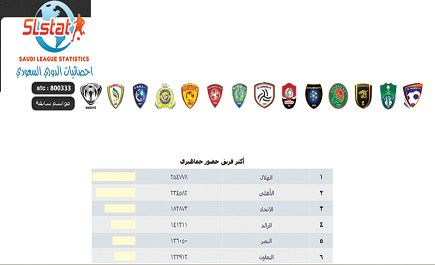 أقل من مليون مشجع.. هذا العدد الرسمي الذي أطلقه موقع إحصائيات الدوري السعودي لعدد الحضور الجماهيري لكافة مباريات دوري زين والذي حافظ من خلاله نادي الهلال على زعامته الجماهيرية الممتدة بحصوله على نصيب الأسد في المباريات التي تلعب داخل أرضه وهي مقياس الجماهيرية للنادي إذ تخطى حاجز الربع مليون مشجع بالملعب في مبارياته الثلاثة عشر بالعاصمة الرياض فيما حل الأهلي ثانيا ثم الاتحاد، وارتقى رائد التحدي ليحقق رابع جماهيرية بالدوري للمرة الأولى رسميا ليأتي بعده خامسا النصر.