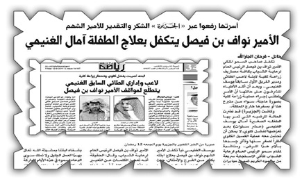هذا وقد قدمت أسرة الغنيمي والطويرب الشكر والتقدير والامتنان لله سبحانه وتعالى ثم لمقام خادم الحرمين الشريفين الملك عبد الله بن عبد العزيز ولصاحب السمو الملكي الأمير نواف بن فيصل بن فهد الرئيس العام لرعاية الشباب على الوقفات غير المستغربة لعلاج الطفلة آمال..