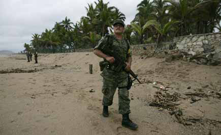 * جندي مكسيكي يمشي في أحد المناطق التي ضربتها العواصف الاستوائية, مما تسببت في إغلاق المدارس وتعطل الحركة ..رويترز