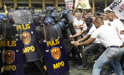 * الشرطة الفلبينية تتصادم مع محتجين ضد الرئيس الفلبيني خارج مبنى الكونجرس في العاصمة مانيلا، حيث تواجدت الشرطة بشكل كثيف.. رويترز