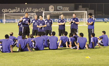 بعيداً عن التدريبات الجماعية للفريق. وقد بدأ العتيبي صباح أمس برنامجه المعد له من الجهاز الفني بشكل انفرادي.هذا وواصل فريق الهلال الأول لكرة القدم تدريباته مساء أمس استعداداً لملاقاة مضيفه «الشعلة» مساء يوم الجمعة المقبل ضمن الجولة السادسة من دوري المحترفين السعودي، والتي قرر الاتحاد السعودي لكرة القدم نقلها إلى استاد الأمير فيصل بن فهد بالرياض، بدلاً من ملعب نادي الشعلة في «الخرج»، واشتملت التدريبات على الجوانب اللياقية والتكتيكية وسط متابعة الأمير نواف بن سعد نائب رئيس النادي، وعدد من أعضاء مجلس الإدارة. من جانب آخر تقرر أن يرأس نائب رئيس نادي الهلال الأمير نواف بن سعد بعثة الفريق المغادرة لكوريا لمواجهة اولسان الكوري في ذهاب ربع نهائي دوري ابطال آسيا يوم الاربعاء المقبل. وعلى خط أخر ينتظم الرباعي الدولي (خالد شراحيلي - سلطان البيشي - ياسر الشهراني - عبدالعزيز الدوسري) بتدريبات الفريق الهلالي يوم غد كون موعد وصولهم سيكون عند التاسعة من مساء اليوم قادمين من فرنسا بعد فراغهم من معسكر منتخبنا الوطني، ويرجح أن لايعتمد عليهم كومبواريه بصفة أساسية في لقاء الشعلة يوم الجمعة المقبل.من ناحية أخرى، ضمّت إدارة المسؤولية الاجتماعية في نادي الهلال سبعة طلاب من جامعتي الإمام محمد بن سعود الإسلامية، والملك سعود، للتدريب التعاوني في الإدارة تحت إشراف رئيسها سعود السبيعي، من أجل تهيئتهم لما يخدم سوق العمل من خلال تنظيم وتوثيق الأعمال التطوعية والخيرية والاجتماعية لهذا العام والأعوام القادمة داخلياً ودولياً، إلى جانب تفعيل دور النادي اجتماعياً وثقافياً، وذلك في إطار أوجه التعاون بين نادي الهلال ومؤسسات المجتمع.