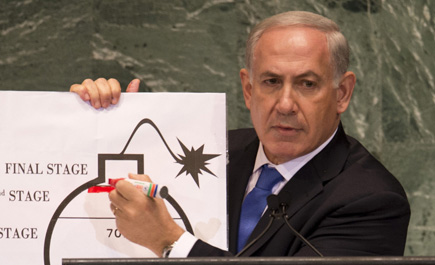 وقال: نحن على ثقة أن الغالبية الساحقة من دول العالم تؤيد مسعانا حرصاً على تعزيز فرص السلام العادل ونحن في مسعانا لا نهدف إلى نزع الشرعيةعن دولة قائمة هي إسرائيل بل إلى تكريس دولة يجب أن تقام هي فلسطين. وانتقد عباس بشدة الاستيطان الاسرائيلي في الاراضي الفلسطينية المحتلة معتبرا انه كارثي وعنصري. ومباشرة انتقد رئيس وزراء اسرائيل بنيامين نتانياهو في خطابه امام الجمعية العامة للامم المتحدة خطاب عباس امام الجمعية العامة ووصفه بانه (افتراء) بعدما اعتبر عباس ان الاستيطان الاسرائيلي (عنصري وكارثي). وفي الشأن الإيراني طالب نتانياهو بوضع خط أحمر واضح لبرنامج تخصيب اليورانيوم الايراني معتبراً ان (ينفد). وقال نتانياهو ان (إيران سترضخ أمام خط أحمر واضح) وقال إن إيران قطعت70%من الطريق التي ستتيح لها تخصيب ما يكفي من اليورانيوم لصنع قنبلة نووية وينبغي منعها من الوصول الى مستوى90%.وعرض نتانياهو من على منصة الامم المتحدة رسماً لقنبلة يشير الى مستويات عدة وقام برسم خط احمر سميك عليه للتوضيح. وقال (الوقت ينفد تاخر الوقت كثيراً الجدول الزمني للبرنامج النووي الايراني لا ينتظر). واضاف ليس هناك ما يمكن ان يهدد مستقبلنا اكثر من حيازة ايران للسلاح النووي.