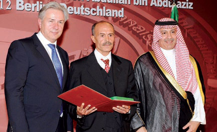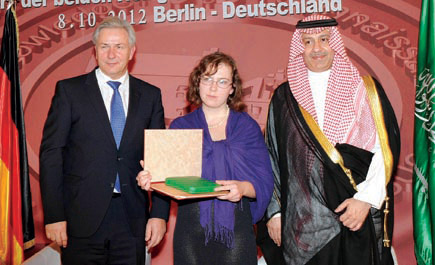 بحضور صاحب السمو الملكي الأمير عبدالعزيز بن عبدالله بن عبدالعزيز نائب وزير الخارجية رئيس مجلس أمناء جائزة خادم الحرمين الشريفين الملك عبدالله بن عبدالعزيز العالمية للترجمة وحاكم مدينة برلين كلاوس فوفرايت، أقيم مساء أمس الأول حفل توزيع جائزة خادم الحرمين الشريفين الملك عبدالله بن عبدالعزيز العالمية للترجمة في دورتها الخامسة, وذلك بقاعة بلدية مدينة برلين. واستهل الحفل بعرض فيلم وثائقي تناول مسيرة الجائزة منذ انطلاقتها قبل خمس سنوات وتطورها وزيادة الأعمال المرشحة للفوز بها مبرزاً المكانة التي بلغتها بالأوساط العلمية والأكاديمية. بعد ذلك ألقى عمدة برلين كلاوس فوفرايت كلمةً أعرب فيها عن تشرف مدينة برلين باحتضان الجائزة التي تكرم المترجمين الذين يجسدون إبداع المؤلفين وينقلونها إلى حضارات أخرى. وأشاد بما شاهده إبان زيارته للمملكة في شهر مارس الماضي والتطور الذي تشهده المملكة في شتى المجالات، مؤكداً أن هناك تنظيماً لمؤتمر اقتصادي كبير لزيادة التعاون السعودي الألماني في مجال الطاقة والصحة. ونوه بالأثر الإيجابي الذي تركه عرض روائع الآثار السعودية بمتحف برلين على الجمهور الألماني الذي تعرف على تاريخ المملكة القديم. وقال: إننا في ألمانيا نؤيد تطلعات الشعوب الإسلامية للحرية والتطور والتنمية، والدين الإسلامي لا يتعارض مع الديمقراطية والحرية»، مبيناً أن مدينة برلين يعيش فيها جنسيات من مختلف أنحاء العالم بأمن وسلام ويسود بينهم التعاون والانفتاح. عقب ذلك ألقى صاحب السمو الملكي الأمير عبدالعزيز بن عبدالله بن عبدالعزيز نائب وزير الخارجية رئيس مجلس أمناء جائزة خادم الحرمين الشريفين الملك عبدالله بن عبدالعزيز العالمية للترجمة كلمةً قال فيها: يسرني أن أرحب بكم في حفل تسليم الجائزة التي نحتفي اليوم في دورتها الخامسة في جمهورية ألمانيا الاتحادية الصديقة بمشاركة هذه النخب الفكرية والثقافية والإعلامية التي تنسج ثقافتها المختلفة في صورة وضيئة للحلم الإنساني الجميل المتعدد المتنوع الذي يعمل على تواصلنا بمختلف صنوف الإبداع والمعرفة، وإذا اختلفت الألسن وتعددت الأفكار فإن هذا الاختلاف والتعدد سمة من السمات البشرية التي أرادها الله أن تتشكل على الأرض من أجل التواصل والتعارف والتعاون». وأوضح سموه أن هذا الحفل يأتي ثمرة للعلاقات الودية الوثيقة بين المملكة العربية السعودية وألمانيا، وحرص القيادتين امشترك على تحقيق تقدم مستمر للعلاقات الثنائية بين البلدين الصديقين، والتنسيق الفعال إزاء القضايا المشتركة. ونقل سموه تحيات خادم الحرمين الشريفين الملك عبدالله بن عبدالعزيز آل سعود -حفظه الله- وعميق تقديره لجمهورية ألمانيا الاتحادية وللدور الذي تقوم به في إثراء حركة الترجمة وحوار الثقافات الإنسانية، وقال سموه: يولي -حفظه الله- عناية خاصة بهذه الجائزة العالمية وتطويرها التي تتواكب ومبادرته الإنسانية للحوار بين أتباع الأديان والثقافات وتعزز الحوار بين الحضارات وفق أطر معرفية متنوعة ومنفتحة نحو المزيد من التقارب والتفاهم الذي يخدم ثقافة السلام وانطلاقاً من قناعة تامة بأهمية الترجمة في تحقيق التقارب بين الشعوب. كما قال سموه: «إن العالم اليوم يتوافق حول الكثير من المفاهيم والقيم الإنسانية التي يؤمن بها ويؤكد أنها أفضل السبل إلى التعايش والتسامح والتقارب كما أن معطيات الماضي الداعية إلى الصراع والتنافر والعداء أصبحت قيماً نمطية سلبية غير مرحب بها في عالم اليوم حتى لو كانت لها أصداء في جوانب علمية أو فنية تهدف لغرس بذور الفرقة والصراع إلا أن العالم اليوم بات أكثر وعياً من ذي قبل مدركاً بأن المتطرفين من الأفراد سوف يقودونا إلى الاندفاع صوب العنف والكراهية، إنه عالم متجدد وفق قيم معاصرة تعتمد على الوعي والتفاهم والبناء الإنساني المشترك وتعاون المؤسسات العلمية، وتتحمل فيه المنابر الثقافية والإعلامية مسؤولية كبيرة في تأسيس القيم الطيبة التي يحملها الوعي الإنسان