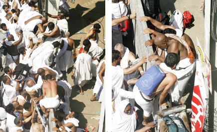 من بعض التصرفات التي رصدتها الجزيرة أمس قيام بعض الحجيج بالتسلق على السياج الفاصل بين جسر المشاة مما جعل البعض يتأذى ولكن تدخل رجال الأمن الحاسم حال دون وقوع إصابات وتمكنوا من السيطرة على الموقف.