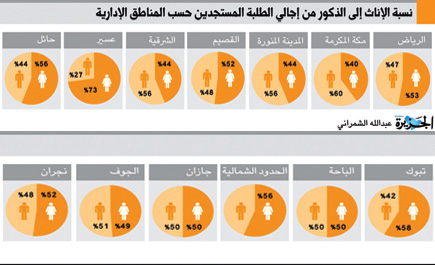 ولكن اللافت في التقرير السنوي للتعليم العالي، هو ما جاء في إحصائيات المناطق، بحسب جنس الطالب، حيث تصدرت منطقة عسير نسبة الطالبات المستجدات بواقع 73 % تقابل 27 % للطلبة الذكور. ما يؤكد زيادة نسبة أعداد البنات في مجتمع عسير على البنين، الذي يعزوه البعض إلى عزوف غالبية البنين عن التعليم العالي والاتجاه إلى الوظائف مباشرة بعد الثانوية العامة. بينما جاءت نسبة المستجدات من البنات والبنين في منطقة الباحة مناصفة بينهما بنسبة 50 %.
