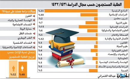وحول توزيع العدد الإجمالي على التخصصات، فقد جاءت «السنة التحضيرية والتأهيلية في الجامعات» أولا بنسبة بلغت 31%، تليها الأعمال التجارية والإدارية، ثم الدراسات الإسلامية، وتليهما باقي التخصصات.